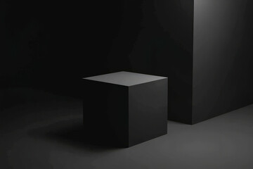 A matte black cube sits centrally on a shadowed, neutral background  Its simple, geometric form commands attention