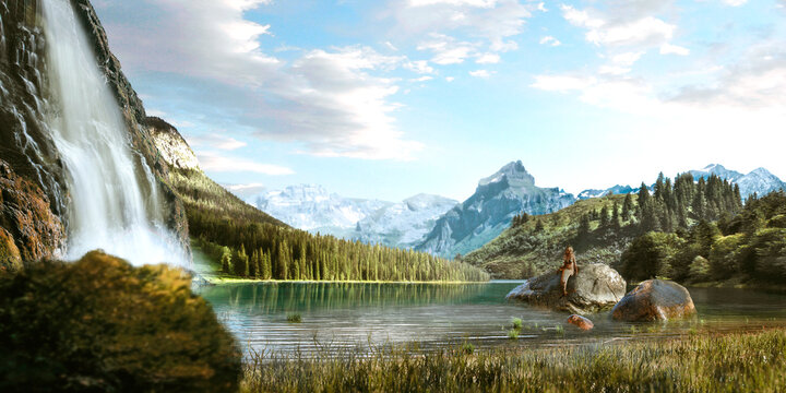 Paisaje surrealista de un lago con una cascada y una sirena sentada sobre una roca