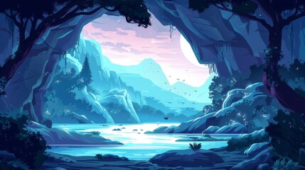 Mystical Moonlight Forest Lake with Rocky Mountains