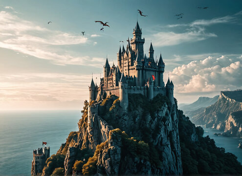 Fantasy castle on a cliff with dragons flying overhead