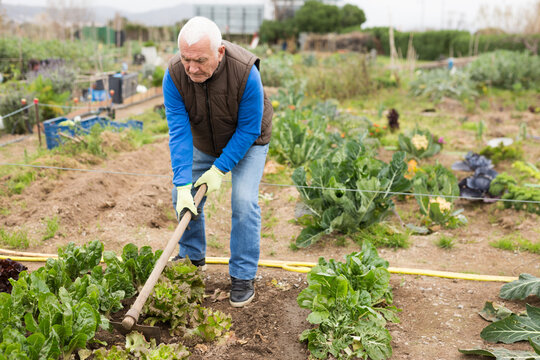 Senior man gardener with mattock working with lettuce in garden outdoor