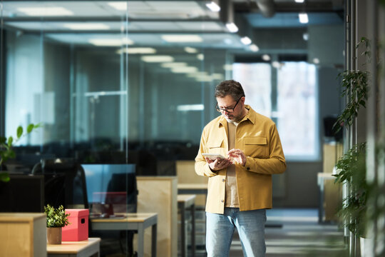 Mature male broker in casual attire using tablet while standing in aisle in openspace office and looking through online financial data