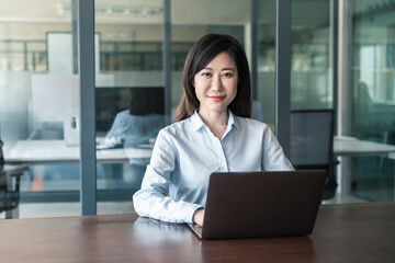 Portrait at camera of 30s it specialist woman in shirt using computer technology for financial bank work online. Mature Asian professional businesswoman working on laptop pc sitting at desk in office