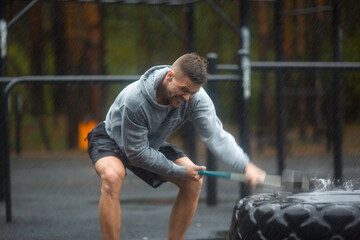 Heavy outdoor training on a rainy day - a man hits a tire with a sledgehammer.