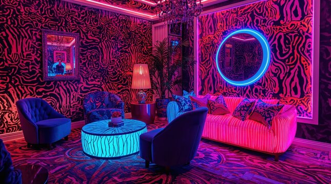 Maximalist Luxurious Lounge Interior with vibrant neon lighting and stylish furniture