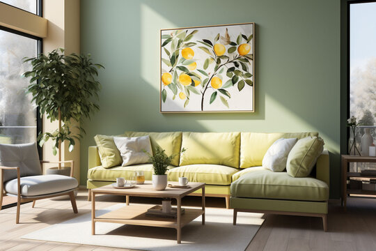 Cozy sage leaf colour living room, couch with green and yellow pillows in sunny day. Picture on the wall. Plant in the pot. Scandinavian interior style. Copy space