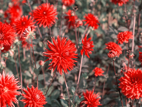 Red dahlia flowers on green field background. Bouquet of red daisy flower. Red chrysanthemum on green grass surface. Summer garden background. Autumn green filed landscape. Flowers growing on meadow.