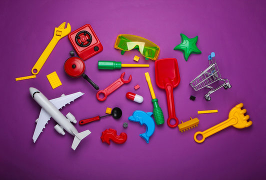 A lot of various children's toys on purple background. Childhood concept. Top view