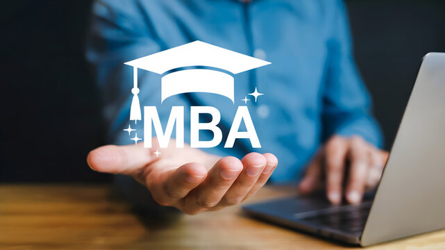 Unlock your future career potential with an MBA, showcasing a graduate cap and the prominent MBA acronym held in an open palm