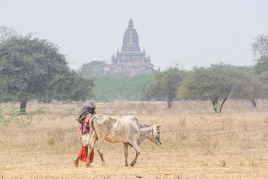Shepherd grazing a gaunt cow through the dry field with temples and pagodas of ancient Bagan on background, Myanmar