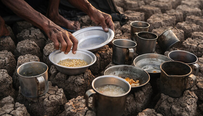 Weathered hands carefully portioning meager food rations into metal bowls on dry cracked earth.