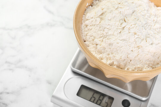 All purpose flour in a silver shaped measuring cup, one cup of flour in a metal measuring cup