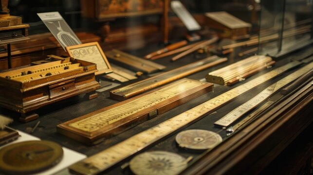 A detailed view of a woodworking tool kit, including measuring instruments and carving tools.