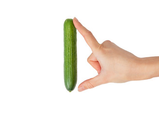 Man penis size concept, hand measuring a small cucumber, isolated on white background.