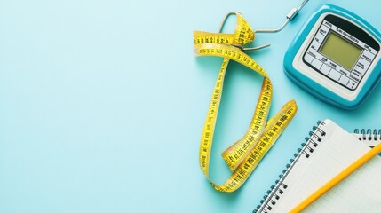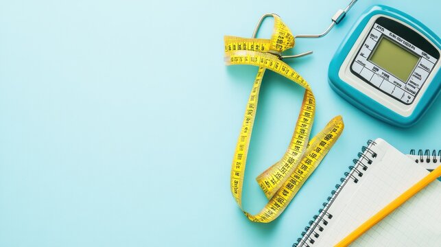 A body fat caliper, measuring tape, and digital scale are arranged on a light blue background, accompanied