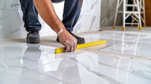 Skilled Laborer Measuring Floor Tile with Yellow Ruler in Modern Renovation Project