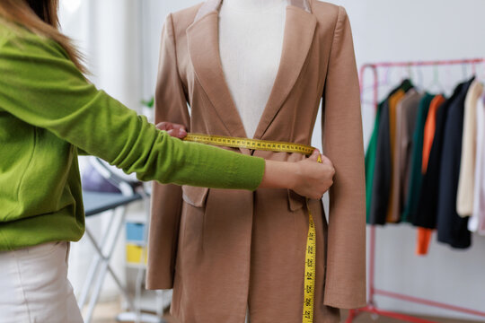 Fashion designer taking measurements of a suit jacket on a mannequin using a tape measure in her workshop