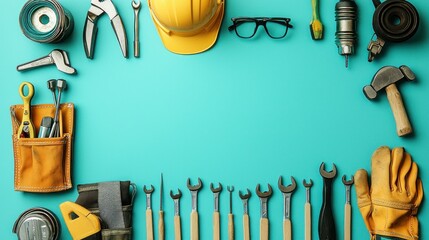 Tools arranged on light blue background
