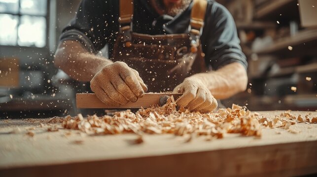 A carpenter measuring and cutting wood in a busy workshop, with sawdust and woodworking tools scattered around, Carpentry scene