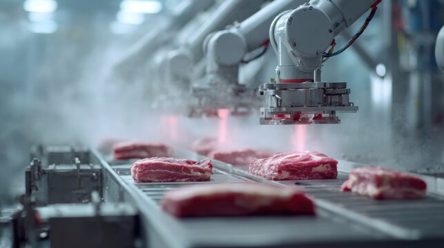 Medium shot capturing a robotic system lifting and arranging meat portions for processing focusing on the machinery with a hazy factory environment behind.