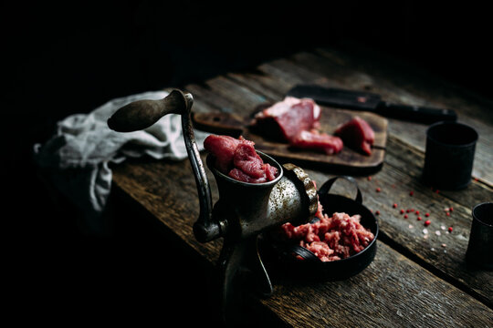 Minced meat comes out of a meat grinder on a dark background, minced meat falls into an iron plate