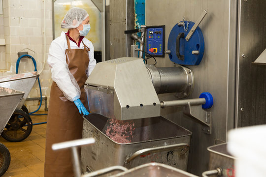 Female making forcemeat on mincer