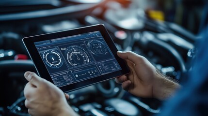 A technician uses a digital tablet to analyze engine data and monitor automotive performance with advanced diagnostic technology. Ideal for smart maintenance, modern vehicle inspection,