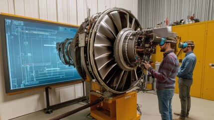 Two engineers engage in virtual reality to enhance turbine design in a technical workshop