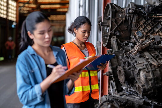 Confident American engineer woman worker holding a clipboard and check stock and take notes in the automotive spare parts warehouse. stock management concept. Stress on work and bored