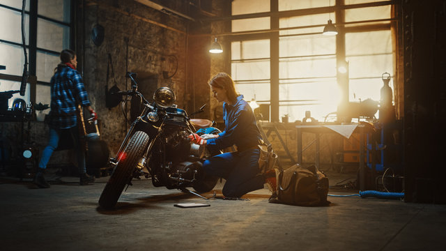 Young Beautiful Female Mechanic is Working on a Custom Bobber Motorcycle. Talented Girl Wearing a Blue Jumpsuit. She Uses a Spanner to Tighten Nut Bolts. Creative Authentic Workshop Garage.
