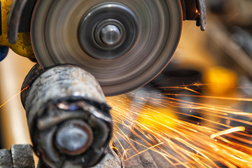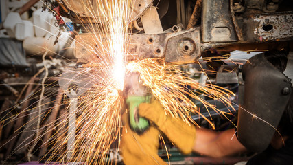 Fire flames are caused by a car mechanic using an electric grinder to grind the iron beam under the car to smooth- Automotive industry and garage concepts.