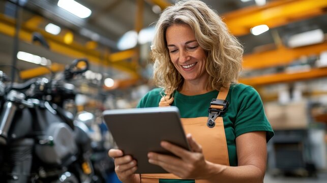Female mechanic using a digital tablet for diagnostics in a bike workshop. Woman technician checking repair manuals on a screen in a garage.