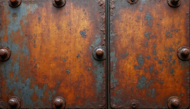 Close up of weathered rusty metal surface. Old iron panels show heavy corrosion, oxidation. Vintage tech texture backdrop with industrial bolts. Material displays brown orange gray colors, detailed