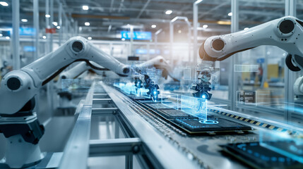 Synchronized voxel robots walking with circuit boards in neon industrial assembly bay