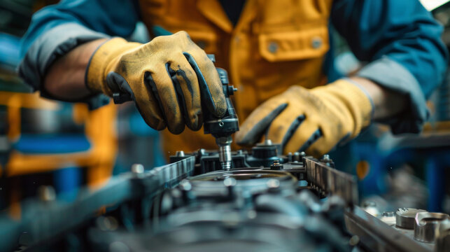 Close-up of a factory worker's hands wearing gloves while using a power tool on an assembly line.