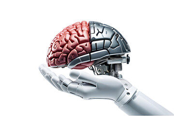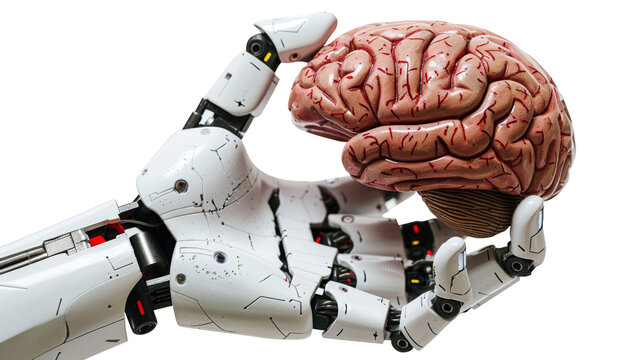 Robot's hand holding a brain isolated on transparent background. Perfect for AI themes, futuristic designs, and technological visuals.