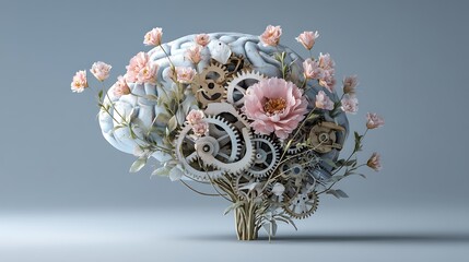 A brain with blooming flowers and mechanical gears growing from it, symbolizing creativity and logic in harmony, conceptual mixed style, ultra-realistic