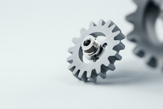 Metal gear wheel with central bearing on white background, shallow depth of field macro photography highlighting industrial mechanical component details.