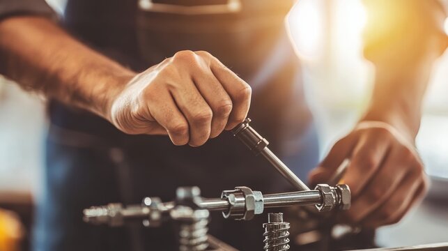 Person assembling mechanical parts in workshop indoors