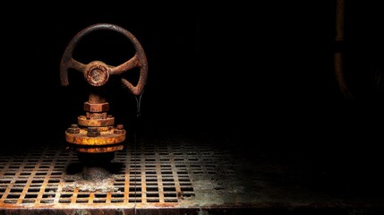 An old industrial valve handle twisted and broken with rust on a metal grate floor in dark lighting