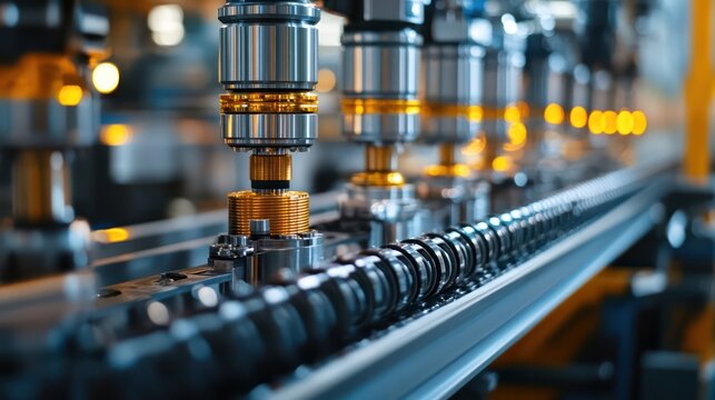 Close-up of mechanical components being assembled on an industrial production line.