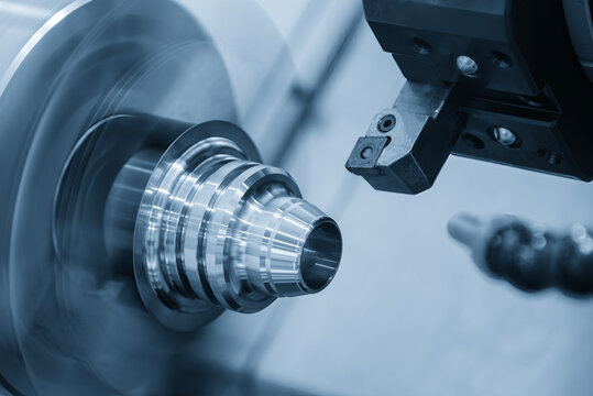 Close up scene the CNC lathe machine cutting the metal cone shape parts in the light blue scene. The high technology metal working process by CNC turning machine.