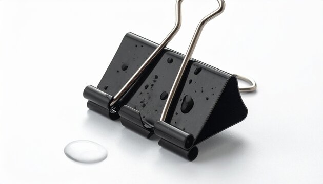Render a black binder clip with triangular metal body and silver wire handles folded upward, isolated on white background, emphasizing mechanical simplicity, office utility, and minimalist design.