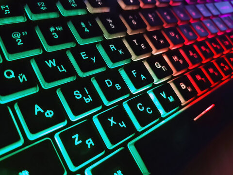 RGB gaming keyboard. Bright colorful keyboard, soft focus. Mechanical keyboard with RGB light, blurred background