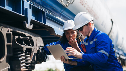Engineers inspecting equipment and discussing maintenance procedures inside a modern industrial factory. Safety, teamwork, and production quality control in a manufacturing plant.