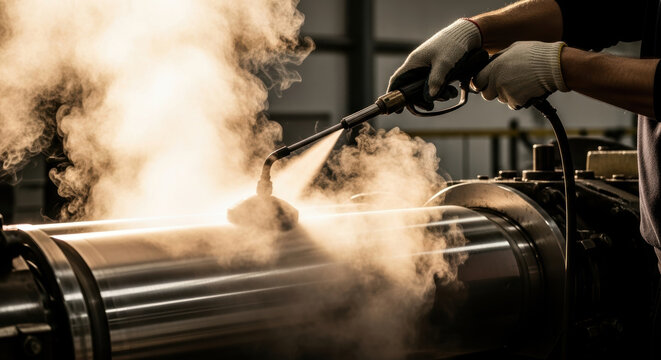 Steam cleaning technician uses high pressure washer to sanitize and clean industrial equipment in factory, focusing on removing dirt and maintaining machinery safety standards