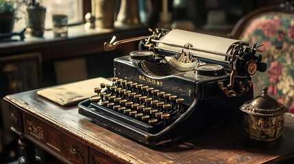 Writer composing novel on vintage typewriter in warm study surrounded by books