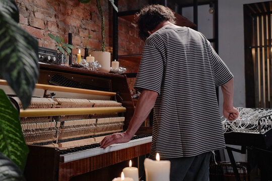 Caucasian man standing at upright piano playing keys with left hand, head slightly bowed, surrounded by lit candles and exposed piano mechanism in cozy indoor setting