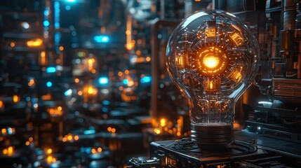 Futuristic lightbulb in a complex, mechanized cityscape