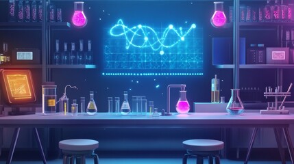 Neon biotech data visualization with dna helix and trend graph on dark tech background